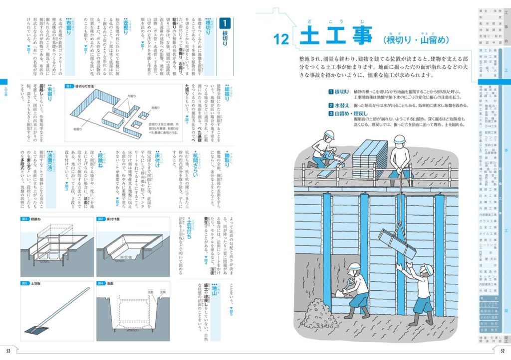 建築や住宅関連の用語を、設計→施工→竣工の流れに沿って掲載しました。重要度や頻度が高い用語には★印をつけています。さらに、具体的にイメージできるようにイラストや写真の図版を900点近く掲載。実務者から、建築・住宅関連の方と打ち合わせをするような一般の方まで、幅広く役立つ内容です。