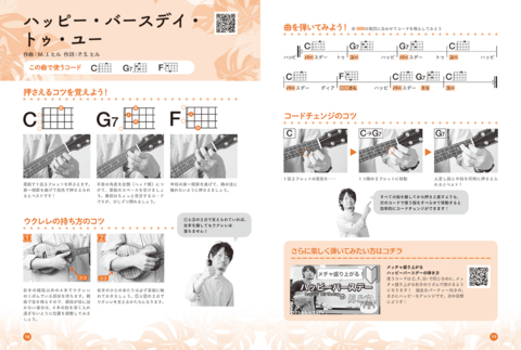 全くの初心者でもひとりではじめられるよう、ウクレレの基礎知識から弾き方まで手取り足取り、丁寧に解説しました。それぞれのページとリンクしたYouTubeの動画をQRコードから視聴することができますので、安心して始められます。