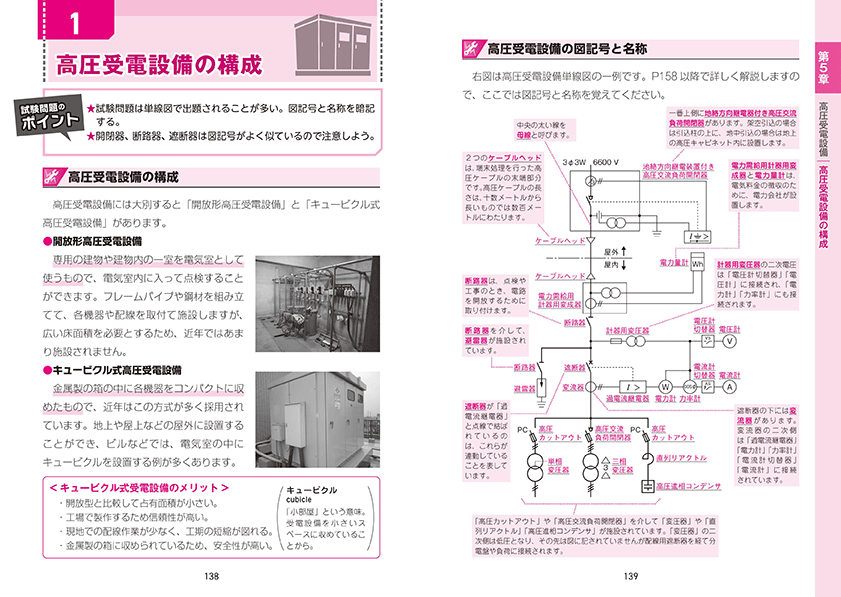 本文中の「試験攻略のポイント」や「ちょっと捕捉」「これも覚えておこう」で効率よく学習できます。そして、「過去問に挑戦!」では理解度をチェックします。計算問題、高圧受電設備、低圧配線工事、接地工事、法規、鑑別について、ていねいに解説しました。目次