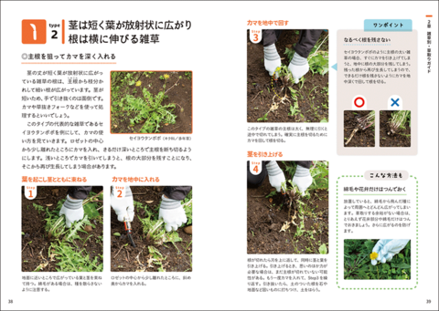 実際の草取りの場面を写真で紹介しています。雑草の種類別にとりやすい方法を例示しています。草取りをする際にヒントになるはずです。