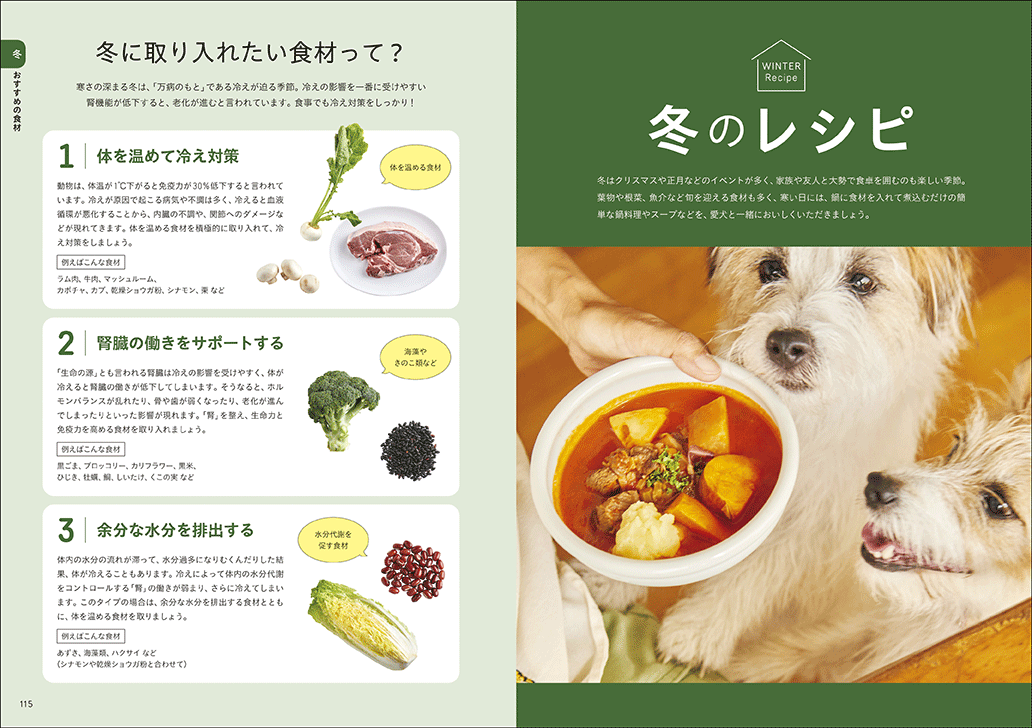 ■効率よく作れる&旬の食材で元気をつくる50レシピ!愛犬のために手作りごはんを実践する飼い主さんに向けて、愛犬と家族のごはんを一緒に作るレシピをご紹介。途中まで一緒に作る、最後の味付けやトッピングを変えるなど、日々のごはんづくりの負担を軽減するアイデアが満載!
