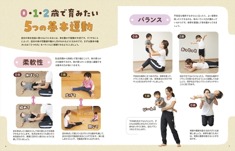 0~1歳では、「柔軟性」「バランス」「支える」「引きつける」「走る・跳ぶ」の5つの基本の動きを中心に、