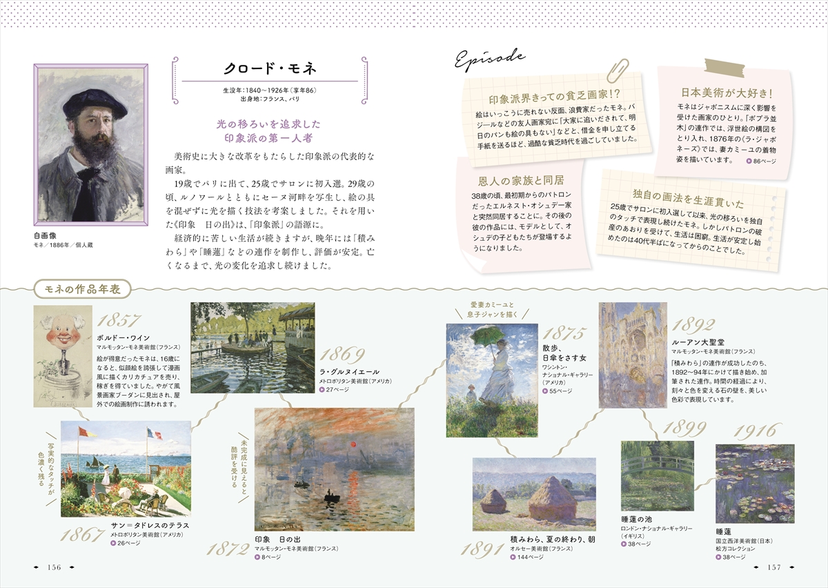 モネ、ルノワール、ドガ、マネ、ゴッホ……印象派を代表する画家たちの人物像やエピソードを紹介しています。画家たちがどんな時代を生き、どんな想いでキャンバスに向かっていたのかを知ることで、作品の魅力をより深く味わうことができます。