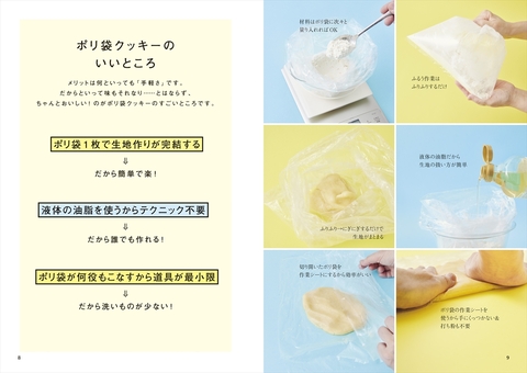 自分好みのクッキーをおうちで手軽に作ろうというのがこの本のコンセプト。初心者でも楽しめるよう、作り方を工夫し、ポリ袋を使ったレシピを考案しました。材料を入れて計量→ふり混ぜる→生地を折りたたんでまとめる、という一連の作業をポリ袋で行うので、特別な道具、テクニックは必要なし。驚くほど簡単に、絶品クッキーが作れます。