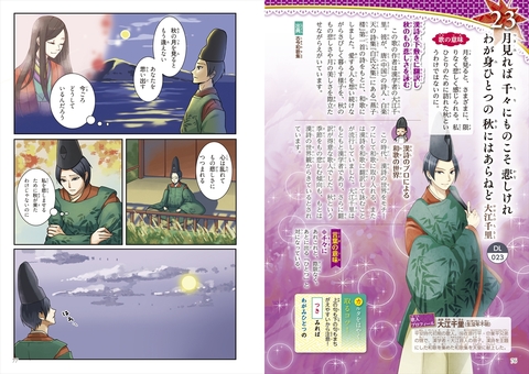 ■百人一首がまんがで楽しくわかる!当時の人々の暮らしぶりがわかる!一首ずつ、歌の意味やその歌にこめられた想いをまんがで楽しく説明しました。美麗なイラストとともに、歌人のプロフィールや言葉の意味をやさしく解説しています。さらに各章の冒頭には、歌が詠まれた時代の人々の暮らしや習慣、恋愛事情などをまんがで紹介。楽しみながら歌の理解が深まります。