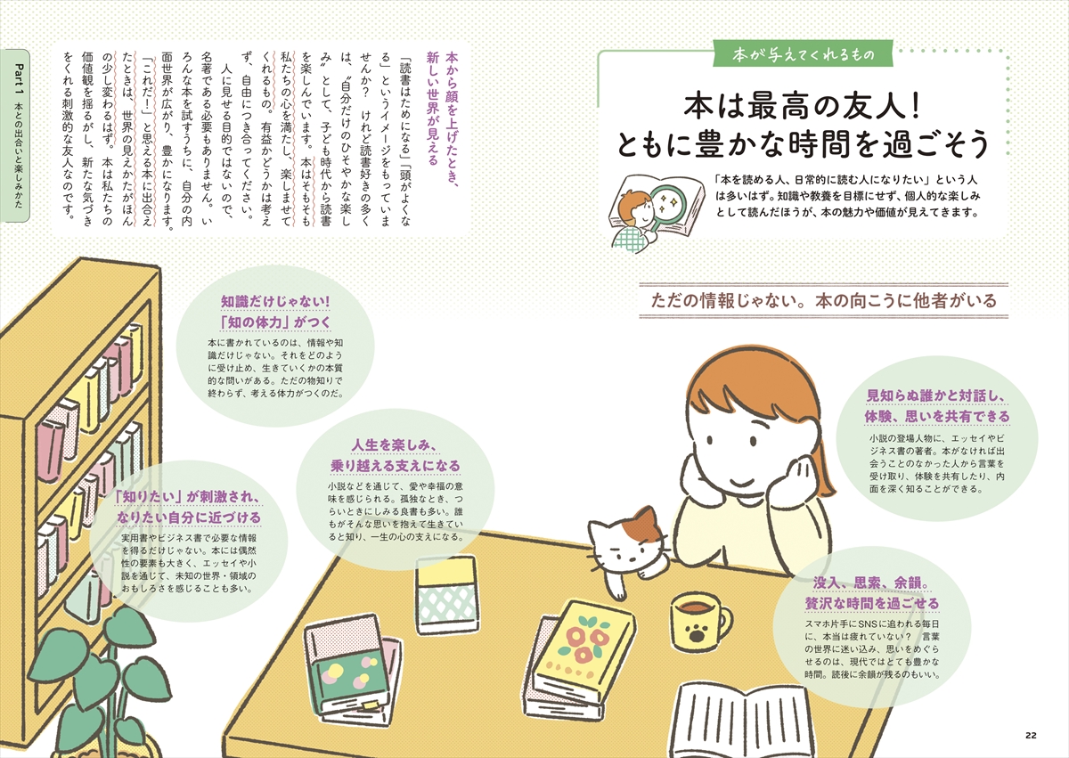 本書では、「小説」「エッセイ」「実用書」を中心に、初心者や苦手意識のある方でも読みやすい書籍を紹介。また、それぞれのジャンルごとに楽しみ方も解説しています。ドラマや映画など映像化された作品、話題になったベストセラーから、笑いたいとき・泣きたいときに読みたいお話、いやされるエッセイ、かわいいものがたくさんつまった本など、読みたい1冊が必ず見つかります。少しでも興味がわいてきたら、そこが本の世界への入り口! はじめの一歩を踏み出してみませんか。