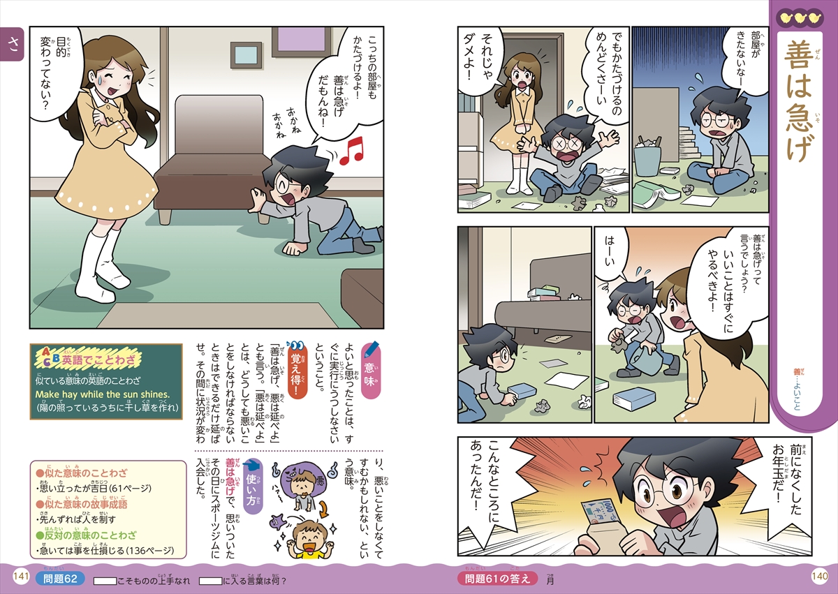 一つひとつのことわざについて、使い方のわかる4コママンガを入れ、意味、由来、使い方、豆知識、英語のことわざなどをコンパクトに解説しています。似た意味や反対の意味を持つ言葉を紹介することで、語彙を一気に増やすことができます。
