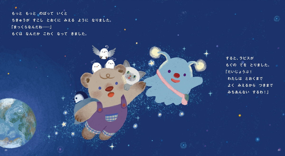 ■もぐと一緒に宇宙のふしぎを見に行こう!物語から芽生える宇宙への好奇心主人公のこぐまのもぐは食いしん坊の男の子。ある日、地球にやってきた宇宙人のラピスと出会います。はぐれてしまったラピスのお友達を探すために、もぐとラピスは仲間と一緒に宇宙を旅します。月や火星、土星のわっかを訪れるもぐたちは、宇宙のふしぎに興味津々。わくわく楽しい物語を通して、宇宙への興味の芽生えを促す絵本です。