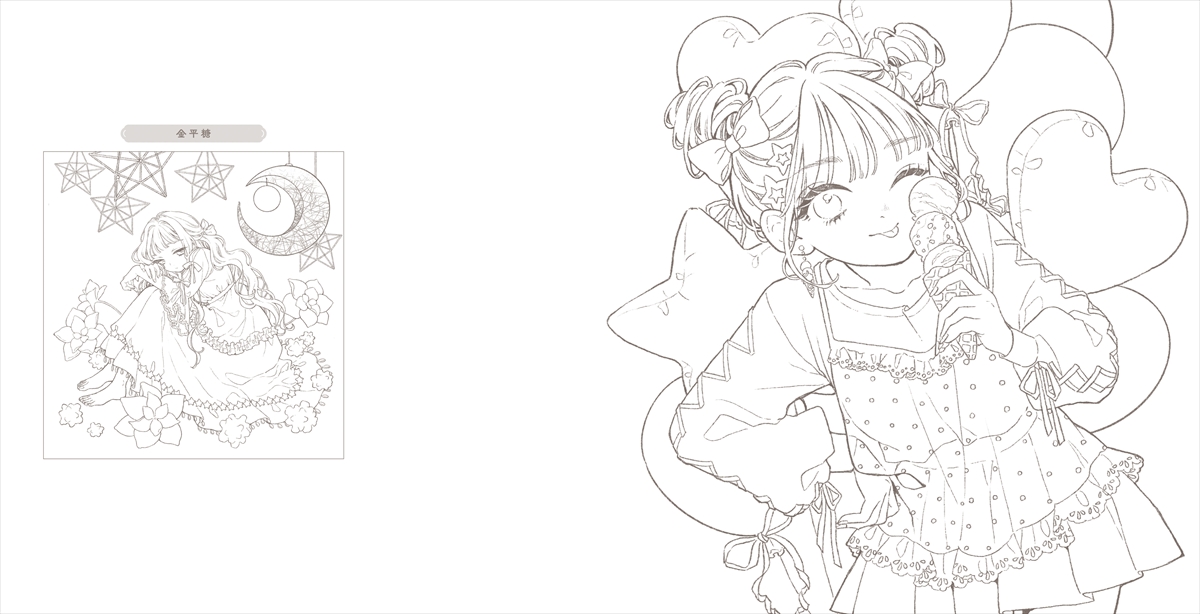 本書では、少女とお菓子がモチーフの40点のぬり絵を収録。