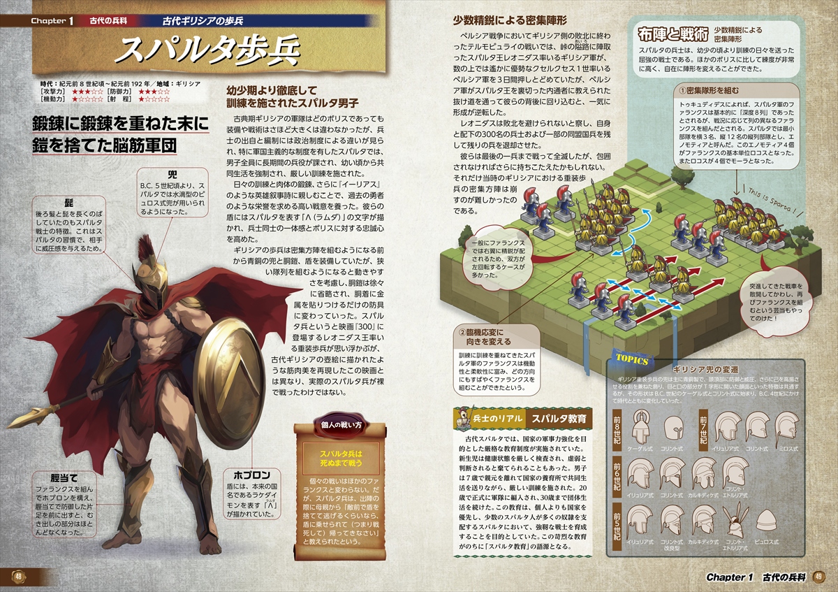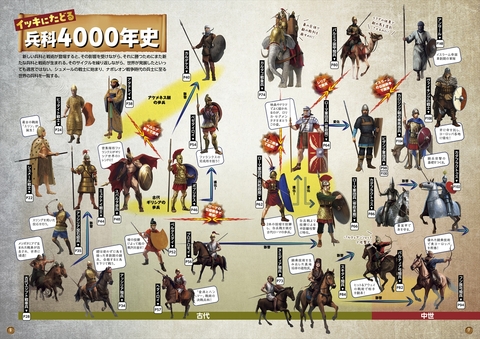 シュメールの戦士からナポレオン時代の近代軍に至るまで、各時代・各地域に存在した特徴的な兵科を取り上げ、装備や武器、防具の変化、部隊の編制、そして戦術の進化を豊富な図版とともに紹介しています。