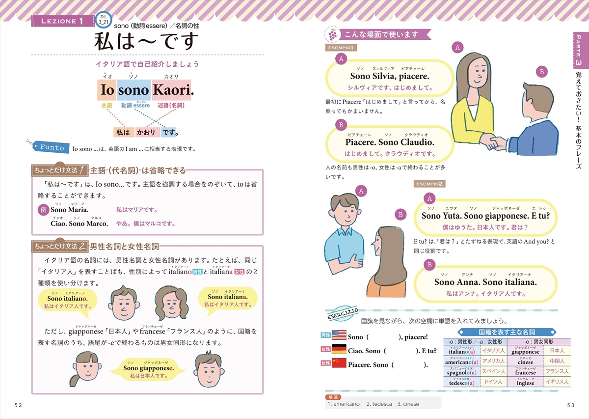 はじめてイタリア語を学習する人に向けた入門書。4ステップの構成で文法のルールから、基本のあいさつ、定番フレーズ、場面別で使えるフレーズなど、初学者が知っておきたい基本がマスターできます。