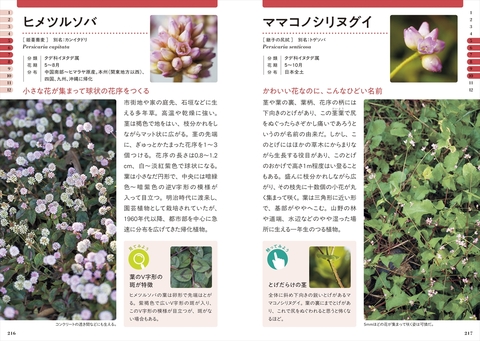各野草の解説ページでは、近似種・近縁種の紹介のほか、「見る・聴く・嗅ぐ・触る・味わう」の五感を使った観察の楽しみ方を紹介しています。茎や葉に触れてみたり、香りをかいでみたり、今まで知らなかった新しい発見があるはずです。