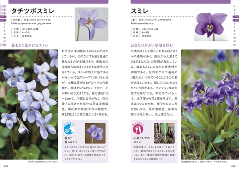名前がわからなくても検索できるように、野草を7系統の色別(白・黄・橙・赤・紫・青・緑/茶)に掲載しています。まずは、野草がどの色に当てはまるか見わけましょう。各色の中は、花期の早い順に掲載しています。また、巻頭にある写真つきの花色インデックスを活用すれば、すばやく検索することができます。