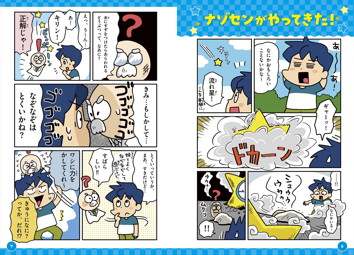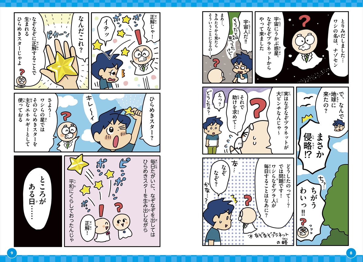 巻頭巻末と章頭には楽しいマンガを掲載。イラストもたくさん掲載しているので、登場人物たちと一緒に楽しみながらなぞなぞに挑戦することができます。なぞなぞは学校やどうぶつ、宇宙などさまざまなテーマごとに章分けしているので、最後まで楽しく読むことができます。