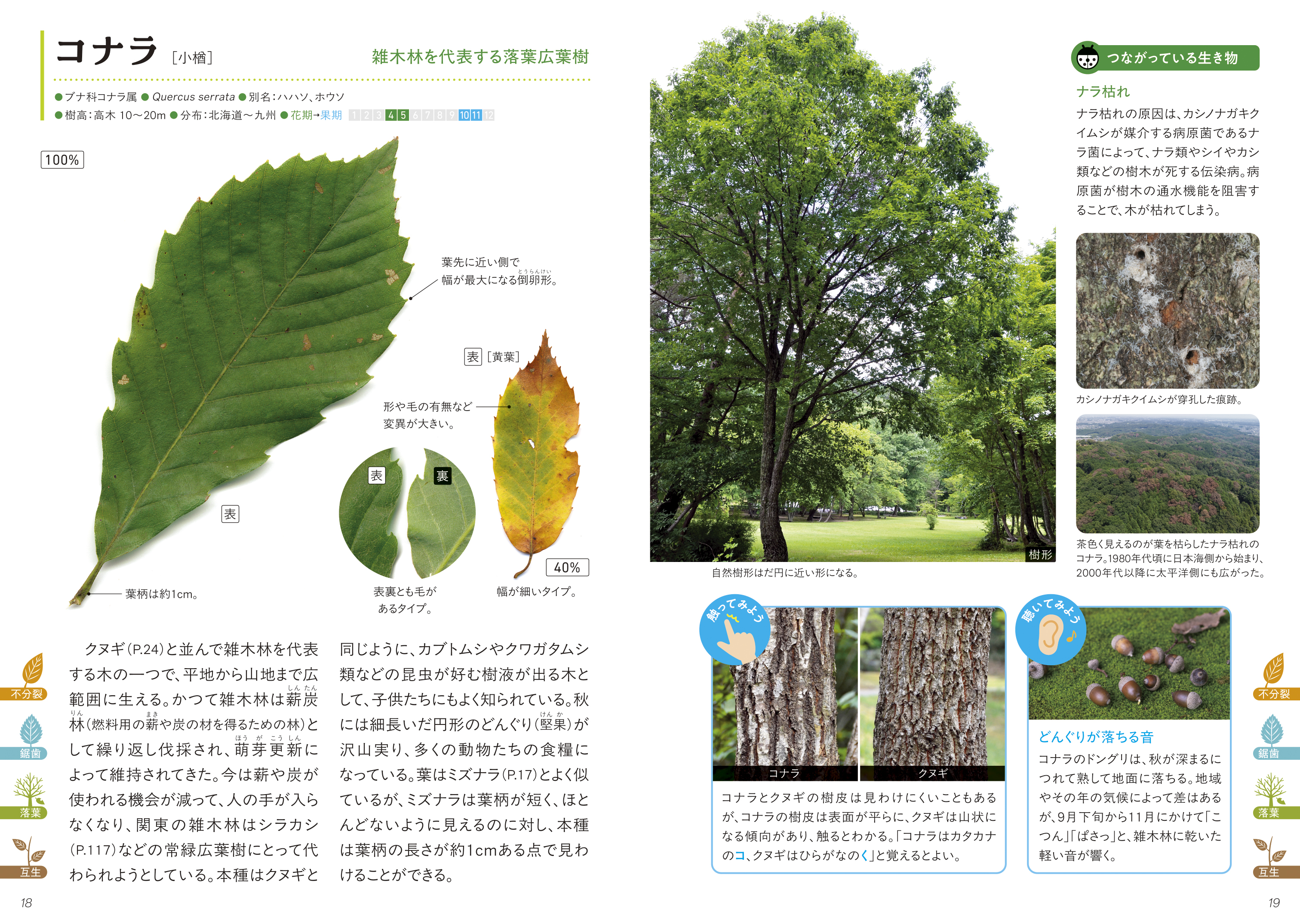 各樹木の解説ページでは、「見る・聴く・かぐ・触る・味わう」の五感を使った観察の楽しみ方、鳥や動物などの樹木とつながっている生き物も紹介しています。