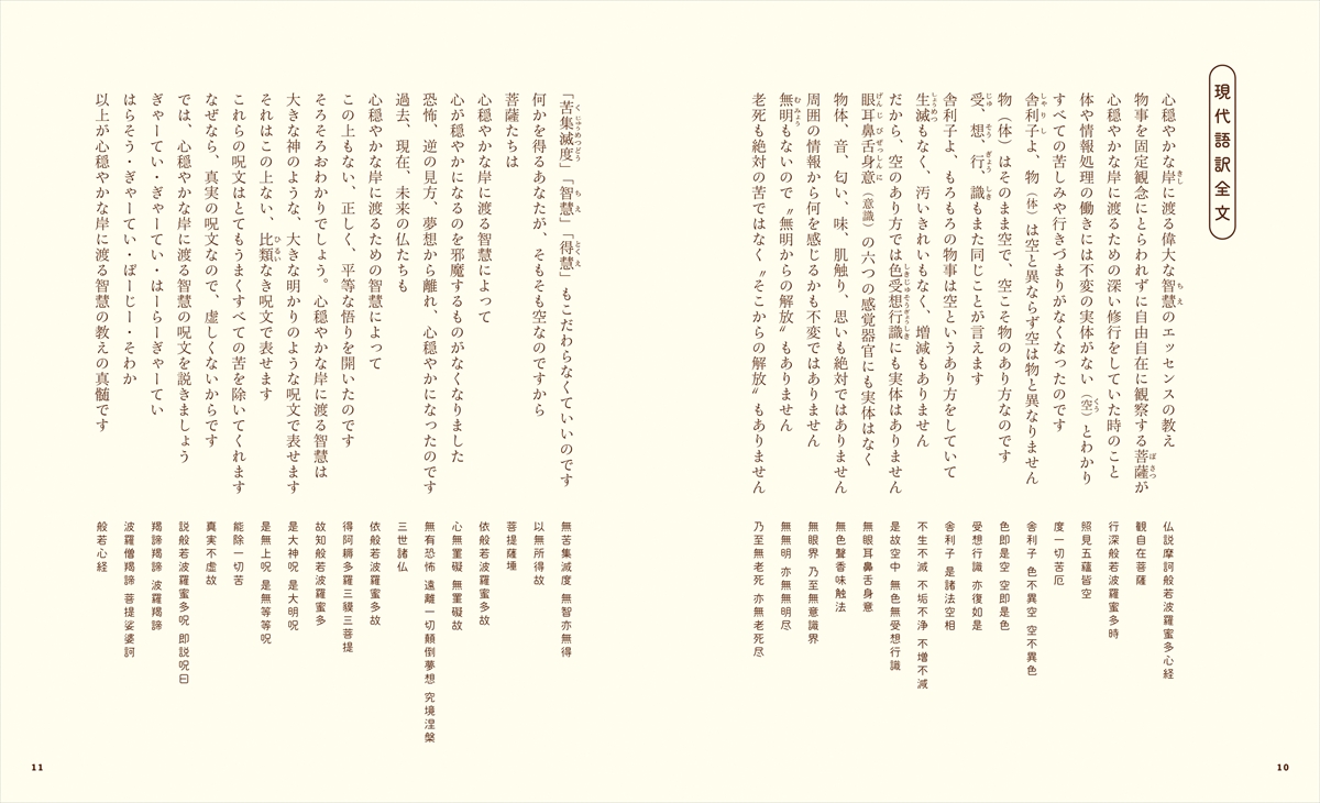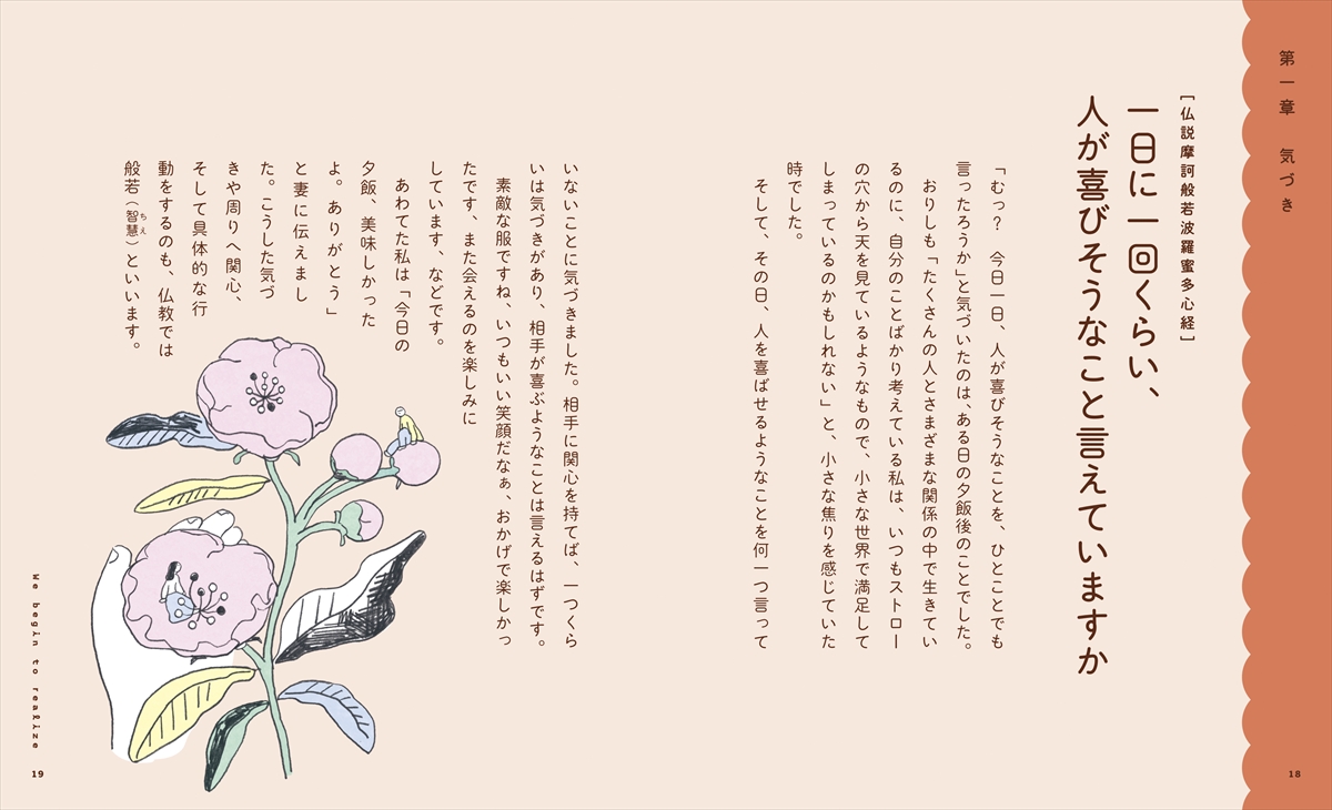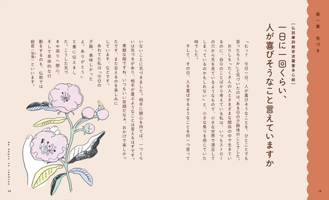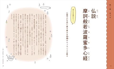 本書では、般若心経を短いフレーズに分け、それぞれのフレーズについて、その意味や内容を解説し、日常生活でおしえを活かすためのヒントとなるエッセイとともに紹介しました。最初から順に読んでいくのはもちろん、気になるところから拾い読みしたり、イラストを眺めたり、自由に楽しんでいただける1冊です。