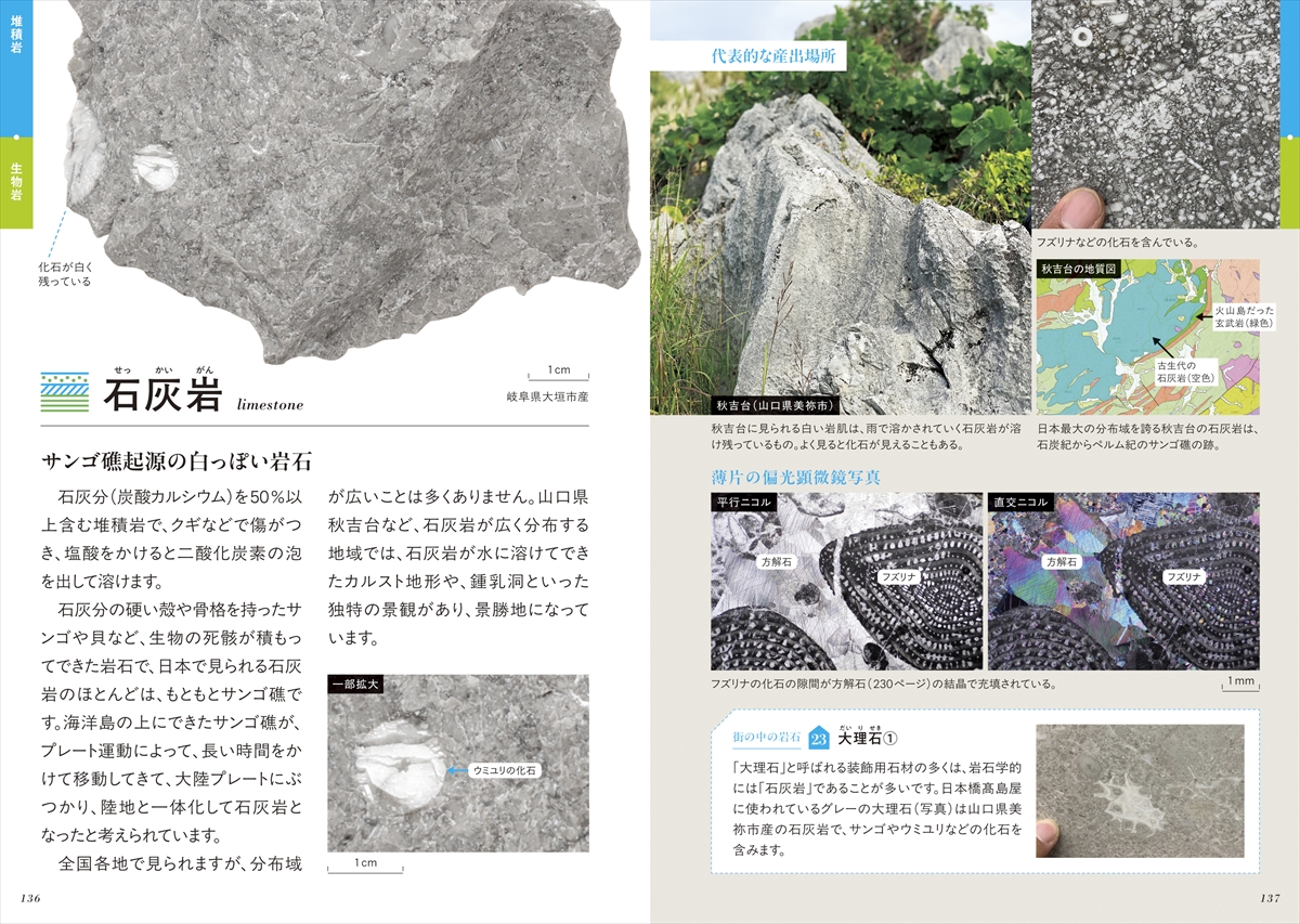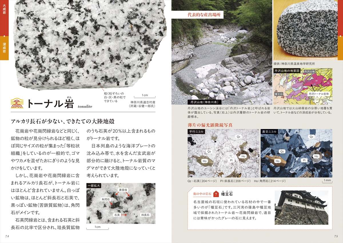 各岩石の特徴や代表的な産出場所の解説のほか、露頭の写真、石の断面や拡大写真、偏光顕微鏡で観察した