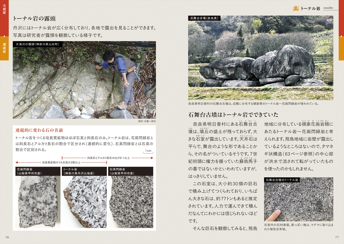 日本列島では、多様な岩石を見ることができ、岩石は石材としても多く用いられています。2章の日本を代表する石材では、掲載種数を追加し、情報も加筆しました。石材が用いられた建築物や採石場などもあわせて紹介しているので、ぜひ観察してみてください。